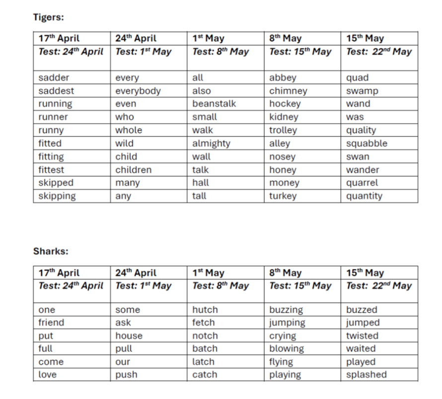 In Year 2, children are grouped as either Spelling Tigers or Spelling Sharks to help support their individual spelling development.