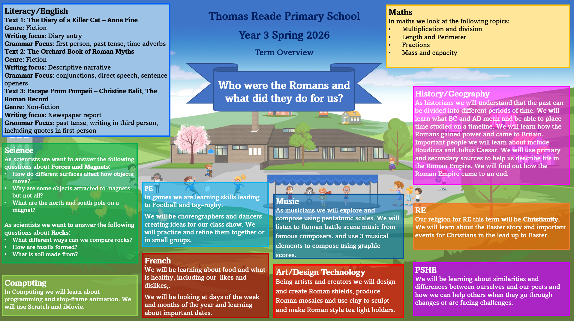 Our enquiry question for the autumn term is 'Who were the Romans and what did they do for us?' and we will learn about this during our Topic lessons.